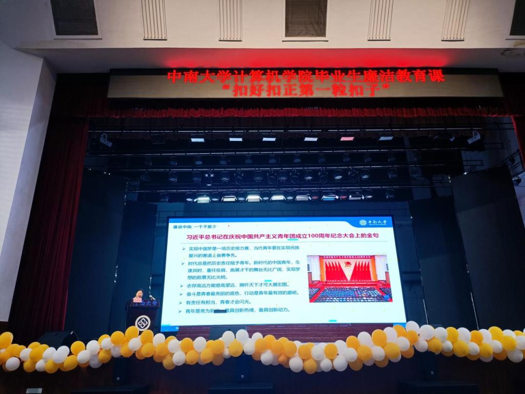 在学习贯彻习近平新时代中国特色社会主义思想主题教育开展之际,计算机院开展“扣正扣好第一粒扣子”廉洁教育,希望毕业生们在勇立潮头面对大风大浪的挑战前,要树立正确的世界观、人生观、价值观,要胸怀大志,明大德、守公德、严私德,清清白白做人、干干净净做事,扣好扣正入职前的第一粒扣子。