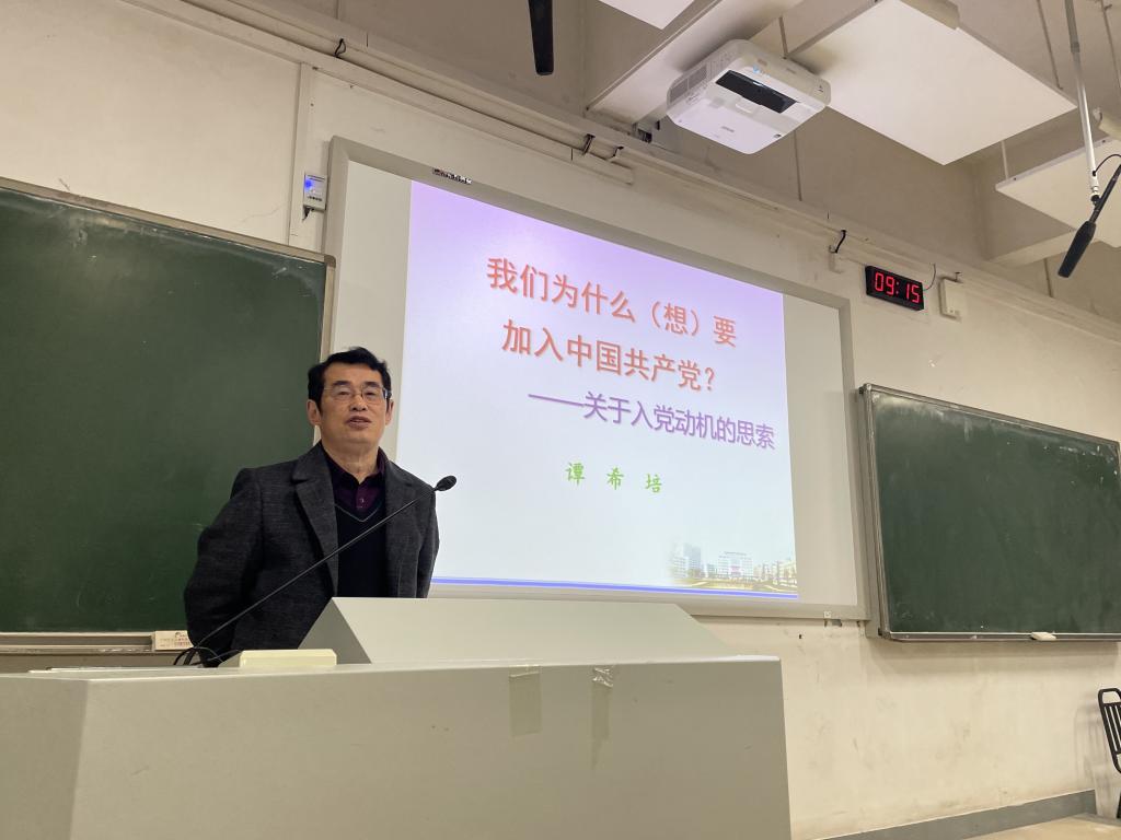 大会的最后一项,由谭希培教授为全体党章小组成员上一堂党课。课堂上,谭教授阐述了他对入党动机的思索,结合自身经历,以当年艰苦奋斗经历开篇,对人的生命进行思考,并教导同学们应如何选择、赋予生命意义,强调有为青年应学会自我激励与约束,铭记党的初心与使命,争取早日加入党的组织。