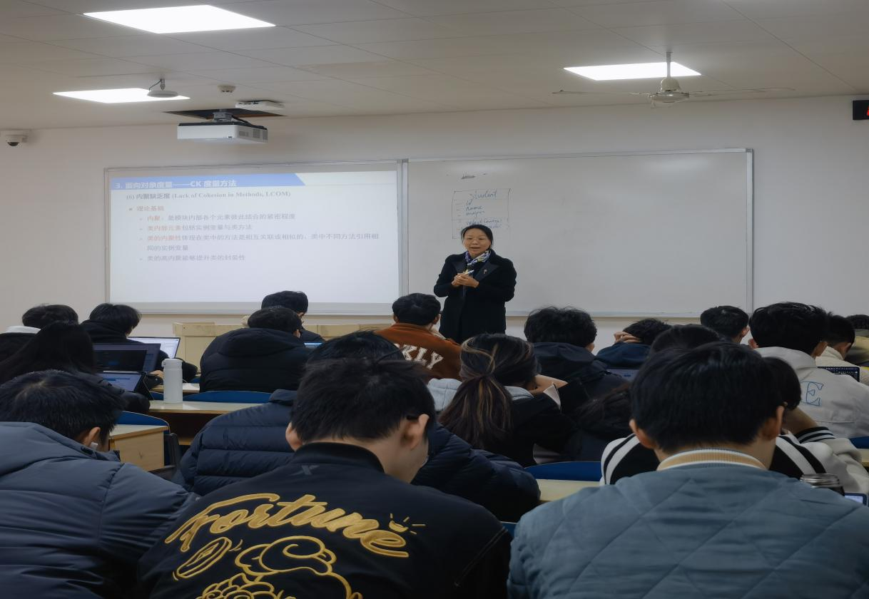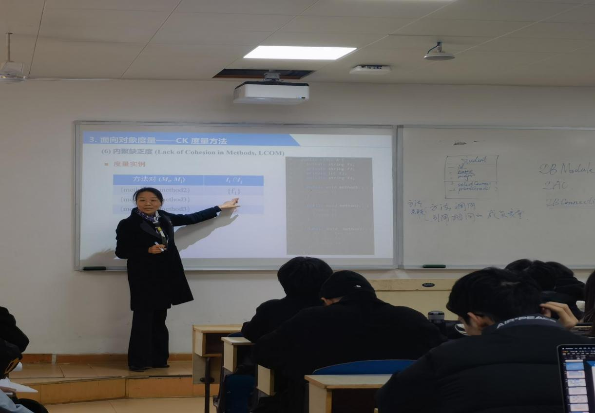 在示范课环节,杨柳老师以“面向对象度量——CK度量方法”为主题展开教学。主要讲授面向对象度量中的CK度量方法,以“教务管理系统”的类图设计与代码实现为案例,介绍了CK度量方法中的六个度量点的度量模型与应用意义。对于其中的内聚缺乏度(LCOM)的度量模型,杨柳老师结合应用案例,启发同学们思考存在的问题,并引入最新学术论文中的多种改进方法。一方面通过导入学科前沿知识,以培养同学们解决复杂问题的综合能力与高阶思维;另一方面有效融入课程思政,鼓励同学们在学习过程中要敢于质疑勇于钻研,以激发他们的思辨能力与创新意识。讲授过程中,结合课程知识图谱对本次课程内容所涉及的前导后续课程的知识点进行融会贯通,包括面向对象程序设计、软件工程、设计模式、软件过程改进等,以加深员工对学科知识的理解。