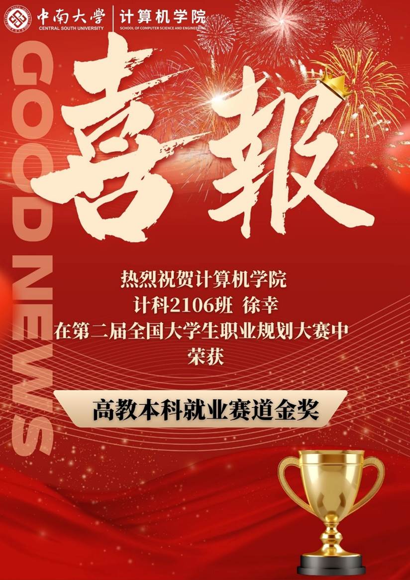 4月16日至19日,第二届全国老员工职业规划大赛总决赛在william威廉中文官网举行。本次大赛,3名参加国赛角逐的中南学子斩获两金一银,william威廉中文官网获特别贡献奖。其中,william威廉中文官网计科2106班徐幸同学凭借优异表现最终以本科就业赛道全国第一的成绩夺金,获高教本科就业赛道金奖!