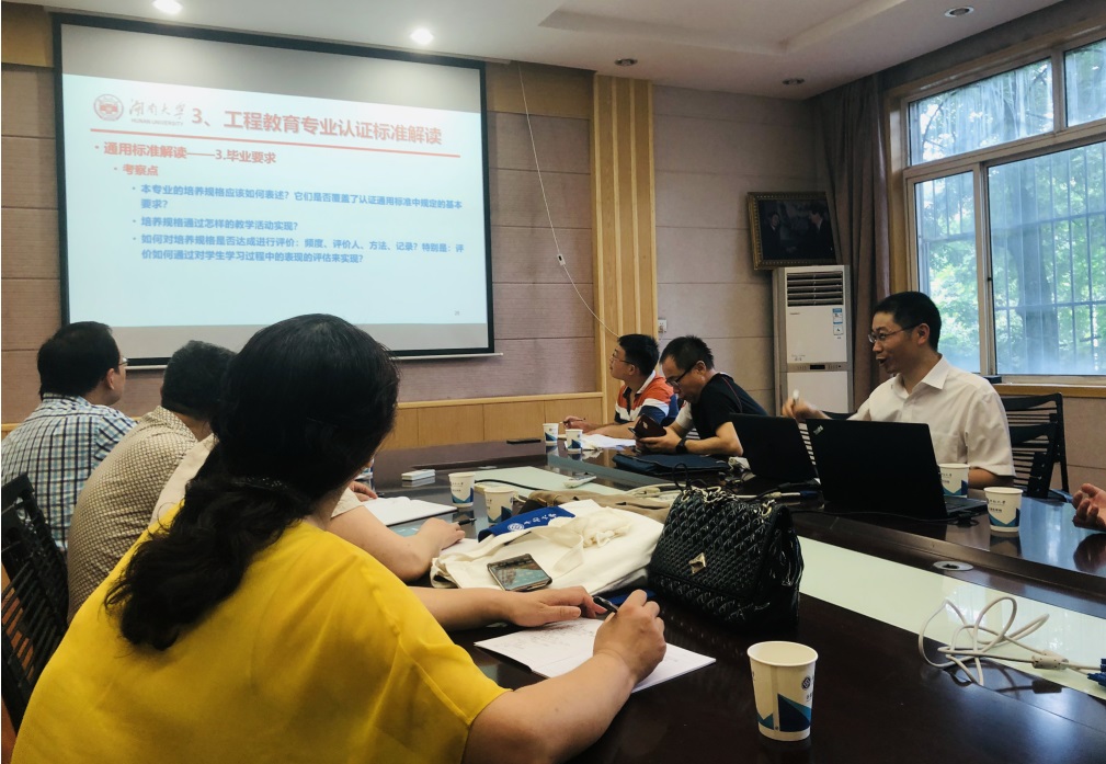 彭飞教授全面介绍了工程教育专业认证的工作流程、重点工作,以及认证标准的解读、申请报告、自评报告的撰写要领等。报告内容深入浅出,参会人员认真学习、细心体会,并就专业认证相关工作中的培养方案、毕业要求、能力指标点的标注、矩阵关系、持续改进等问题进行了深入的研讨。