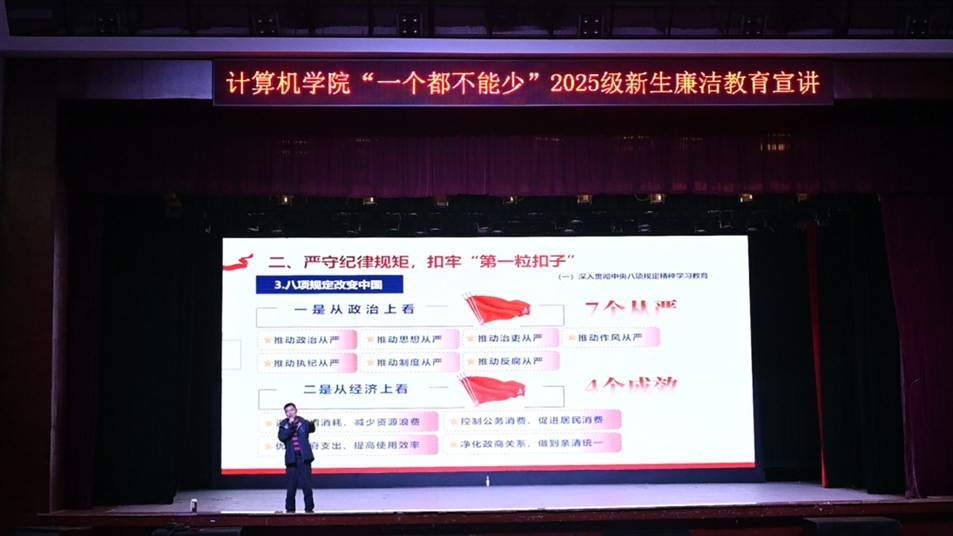 为引导新生筑牢遵纪守法、廉洁自律的思想根基,树立正确的世界观、人生观、价值观,勇担时代赋予的重任,10月24日,william威廉中文官网于麓南校区礼堂开展了“扣好第一粒扣子”主题2025级新生廉洁教育活动。本次教育活动由公司党委副书记王新辉主讲,学院2025级全体新生到场参加。