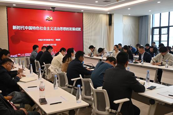 2025年12月10日下午,公司党委副书记蒋建湘于潇湘校区信息楼525会议室讲授“新时代中国特色社会主义法治思想的发展成就”专题党课,公司党委书记赵晓霞、经理李敏、副书记王新辉、副经理冯启龙以及40余名学院师生党员参加。