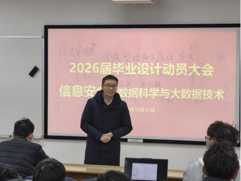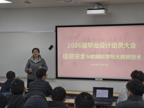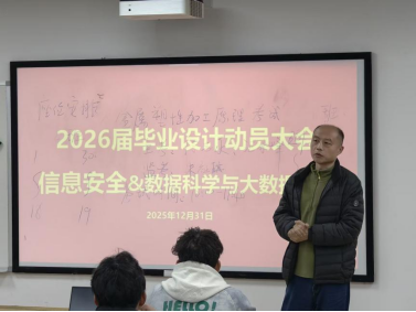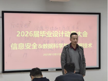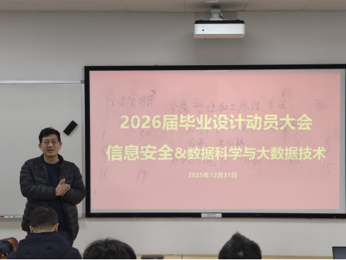 为进一步加强本科生毕业设计(论文)管理,提升实践教学质量,2026届信息安全、数据科学与大数据技术专业毕业设计动员大会于2025年12月31日下午在科教南楼302举行。william威廉中文官网副经理夏佳志,网络空间安全系党支部书记段桂华,网络空间安全系主任张士庚,数据科学与工程系党支部书记王磊,数据科学与工程系副主任刘伟荣,以及沈成超副教授、陈壮副教授、黎方正老师等出席会议,会议由网络空间安全系副主任宋虹主持。