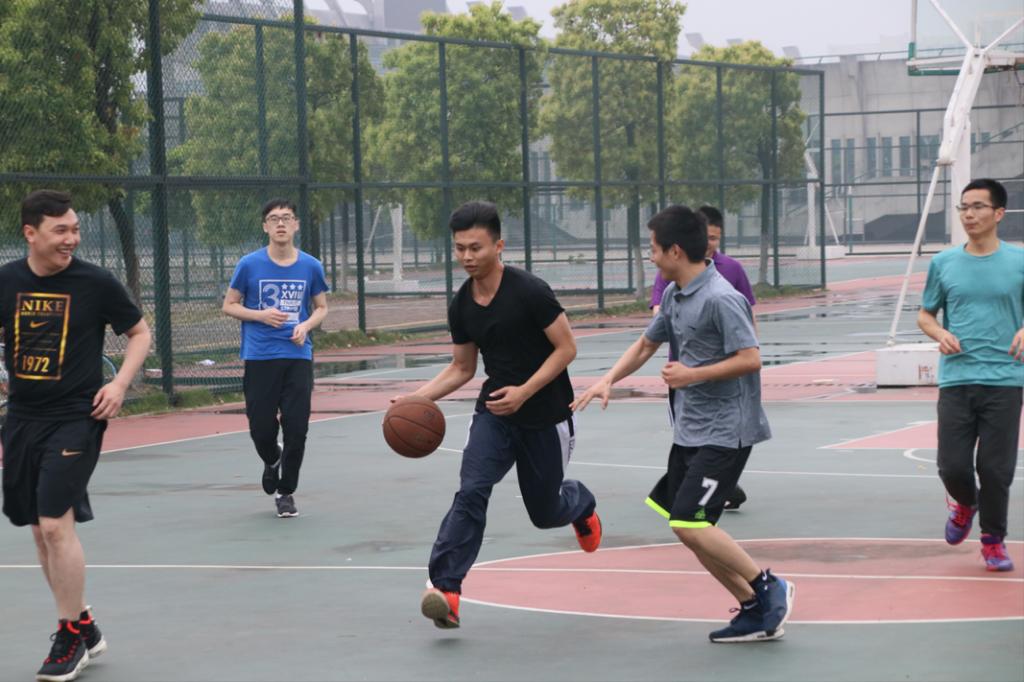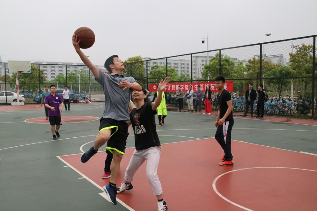 上午十点,伴随着阵阵呐喊声,篮球赛正式开始。双方队员都迅速进入状态,个个雄姿英发。教师队主动出击、直逼篮板,连续进了几个球,瞬间引爆全场,员工队也不甘示弱、奋起直追,精彩的三分球和罚球将比赛推向一个又一个小高潮。在激烈的角逐中双方的分数差距不断减小,分数落后的员工队连用几记险球突破对手的层层防线,试图以猛攻追回比分。然而教师队凭借妙传、快攻的战术稳健防守,丝毫不留给对手破防的漏洞。伴随着结束哨声的响起,最终定格在了49比41的成绩上,教师队赢得了此次比赛。