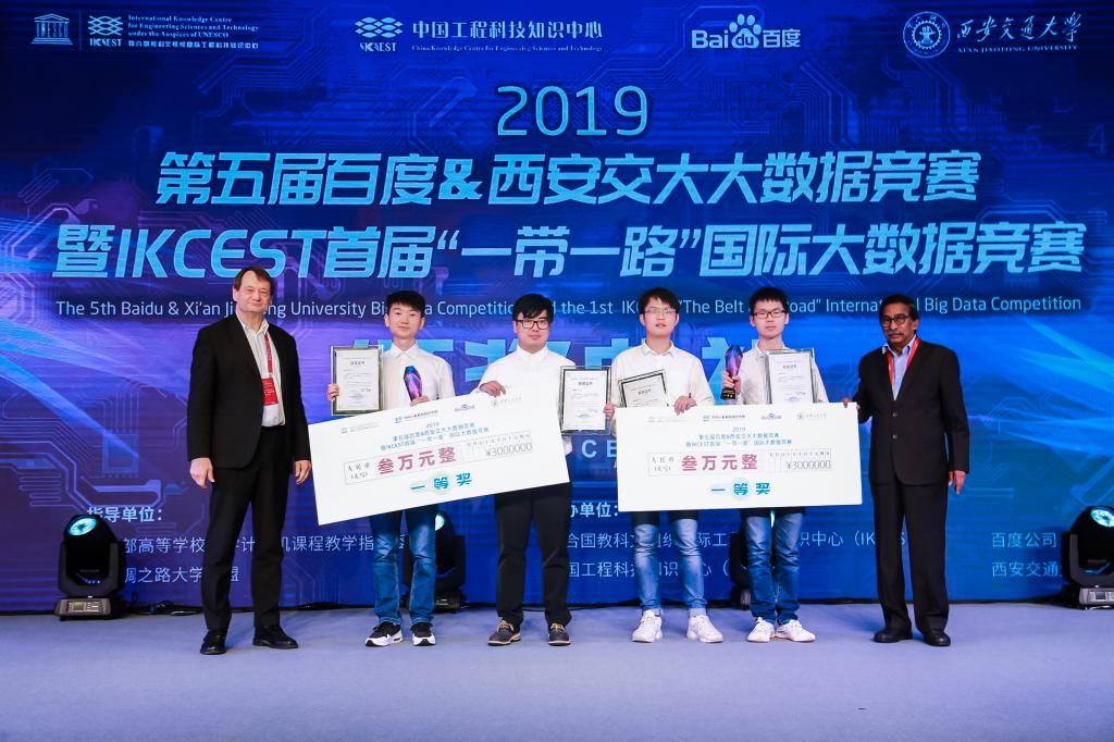 2019年9月11日,由联合国教科文组织、百度、西安交通大学等单位联合主办的“2019第五届百度&西安交大大数据竞赛暨IKCEST首届“一带一路”国际大数据竞赛”在西安落下帷幕。竞赛共有来自16个国家的2312支赛队参加,覆盖国内42所“双一流高校”,以及哈佛大学、牛津大学、苏黎世理工、帝国理工大学等国际名校。公司18级硕士研究生罗涛、李迎港、李楠、王艺霏与华南理工大学员工陈暄群组成的参赛队伍,在郭克华、张士庚老师的指导下,在该项赛事中荣获一等奖。