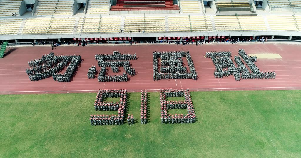 一寸山河一寸血,十万青年十万军。2019级新生整齐而肃穆地立于草地之上,目光坚毅,气氛庄严, 摆出“9.18 勿忘国耻”、“9.18 振兴中华”等图案,并一起高举国旗,以此表达对先烈的敬意,抒发爱国情。