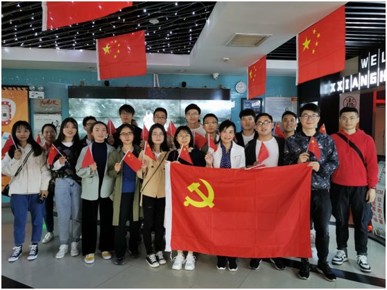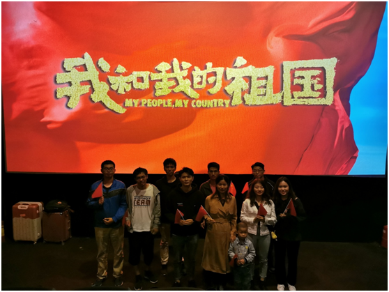 10月7日13时30分,参加观影活动的党员同志来到步步高湘核影城集中等待,党员同学们非常激动,纷纷挥舞着手中的五星红旗,高唱《歌唱祖国》《我和我的祖国》等爱国歌曲。
