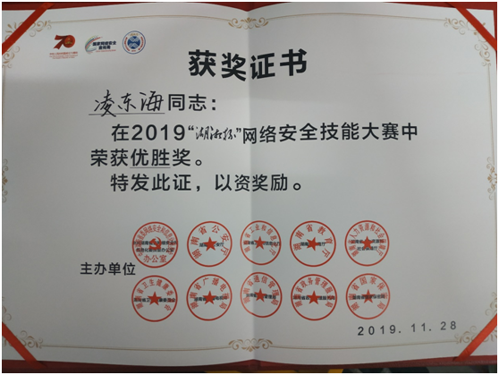 11月28日,2019湖南(长沙)网络安全·智能制造大会在长沙国际会展中心正式开幕,会上对2019“湖湘杯”网络安全技能大赛系列活动进行表彰。william威廉中文官网极光网络安全实验室的同学在2019“湖湘杯”网络安全技能大赛系列活动——关键信息基础设施网络安全应急演练比赛中获得二等奖,同时在湖湘杯网络技能大赛决赛中获得优胜奖。