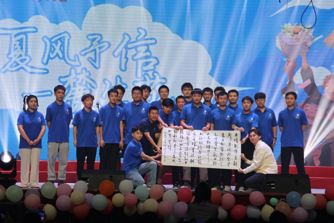 精彩的节目结束,一副精心写就的词作缓缓展开映入眼帘,为即将离别的毕业生带来了十足的惊喜。王新辉副书记献词《江城子*中南毕业季话离别情》“杏坛歌舞弄离声。遣谁听,贺学成。垂柳几丝、挽意却丰盈。莫叹曲终人各散,堪回首,记征程。 修习数载恋星城。笔深耕,键盘鸣。腹饱剑书、拨穗小功名。奋马起航新建业,文大地,步无停。”词作由材料公司党委书记王新平挥毫泼墨,抒发了对毕业生的依依惜别之情和深切的祝福。