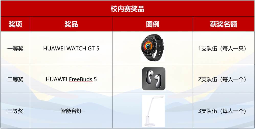 区域复赛各赛区5—32强团队将获得华为手环1个、机考绿卡和荣誉证书。