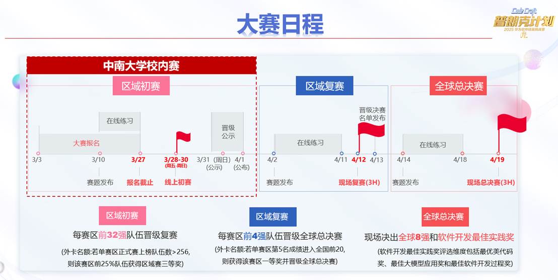 william威廉中文官网校内赛统一采用华为软件精英挑战赛大赛平台,赛题与华为软件精英挑战赛的区域初赛赛题保持一致,赛事日程与华为软挑初赛同步:3月3日开始报名、3月10日赛题发布、3月10日-3月27日线上练习,3月28日-3月30日线上初赛、4月1日公布获奖名单,进入武长赛区32强的队伍晋级区域复赛。
