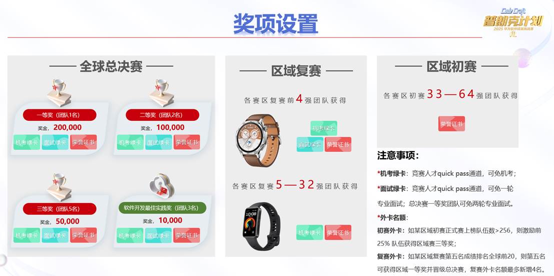 各赛区前4强团队除了获得全球总决赛晋级资格,还将获得华为手表1支、机考绿卡、面试绿卡和荣誉证书;