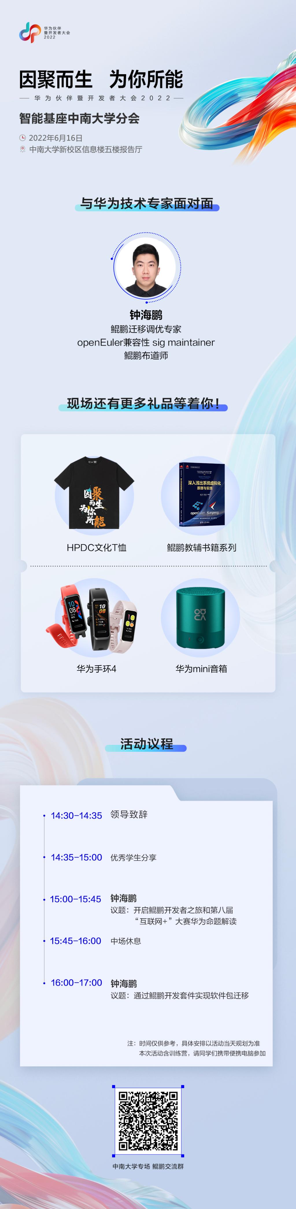 因聚而生,为你所能。与鲲鹏迁移调优专家、鲲鹏布道师钟海鹏面对面,现场华为手环、华为mini音响、文化衫、鲲鹏教辅书籍等多种好礼等着你!