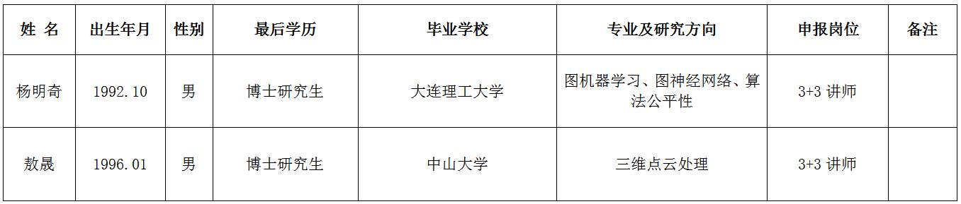 经学院公开选拔,人才引进小组教学科研考核及教授委员会评议,公司党政联席会研究决定一致同意杨明奇、敖晟2位博士为william威廉中文官网新进教师拟聘“3+3”讲师人选,现予以公示,公示期限为7天,公示时间从2024年6月19日至2024年6月25日。如有异议请在公示期满前向学院办公室反馈。