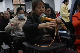 经过介绍,爷爷奶奶们已经对艾草锤的作用有了基本认识。志愿者们并没有将艾草锤成品直接交给爷爷奶奶们,而是送给了他们材料,由志愿者们进行教学。“自己动手,丰衣足食”的道理是老一辈最明白的道理,而他们的心灵手巧也着实让同学们大吃一惊——让同学们焦头烂额的艾草锤的制作,我们的“老朋友”们却做的又快又好。看到有困难的爷爷奶奶,不少志愿者们上前指导帮忙,爷爷奶奶们自己互相帮助,讲堂现场其乐融融。艾草锤制作完成后,同学们介绍其使用方法和功效,通过捶打身体穴位,如肩颈、腰背、腿部等,能让艾草的药效渗透肌肤,起到放松肌肉、缓解疲劳、促进局部血液循环的作用,帮助爷爷奶奶们缓解身体酸痛和不适。