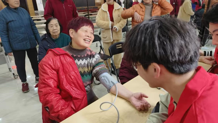 活动伊始,由志愿者们给老人们现场测量血压心率。老人表示出对自己血压情况的担心。在测量过程中,志愿者与老人聊天问候,讲解不同年龄段的血压正常范围,过程充满温情与欢乐。