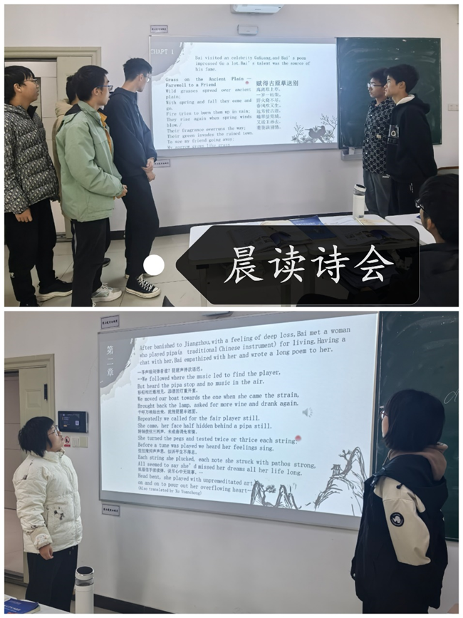 晨读开展过程中,每个班级都积极创新活动形式,激发同学们的参与热情。软件工程2403班、软件工程2404班通过英语单词接龙、百词斩打卡等方式开展“四级单词大作战”,增加同学们的词汇量,帮助同学们对英语四级考试进行有效备考,点燃了同学们对于英语学习的兴趣。计算机类2408班以“晨读诗会”为特色,在晨光中朗诵经典诗词,感受中华文化的魅力。计算机类2409班则开展了诗词接龙活动,让同学们在诗词中感受中华文化的博大精深,提升人文素养,促进全面发展。