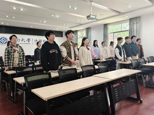 会议伊始,全体成员起立,奏唱中华人民共和国国歌。嘹亮的国歌声中,研会成员们庄严肃穆,表达了对祖国的无限敬意和热爱。