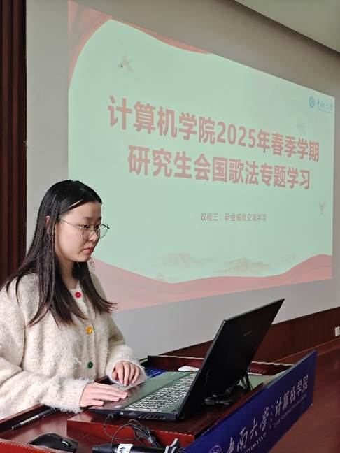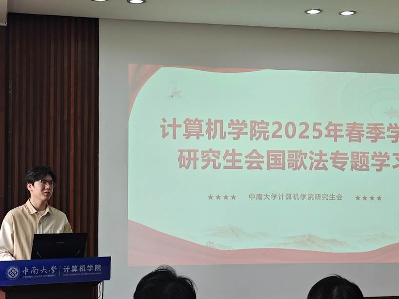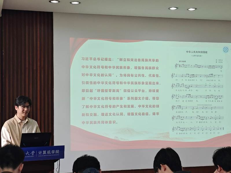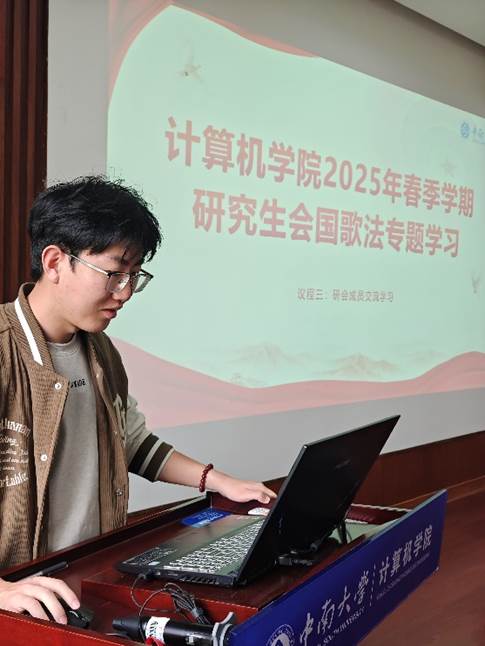 随后,会议进入了第二项议程——学习国歌法。叶伟同学详细讲解了国歌法的立法背景、国歌的历史、国歌的使用规范等内容。他结合生动的案例和丰富的史料,深入浅出地为同学们普及了国歌法相关知识。同学们认真听讲,积极互动,现场氛围热烈。