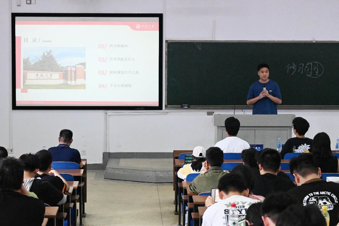 刘晨同学就考公这一方向进行了深入讲解。他介绍了考公的政策、流程和考试内容,分享了自己的备考经验和心得,建议同学们制定科学合理的备考计划,在备考中注重基础知识的积累和解题技巧的训练,同时有意识地提升自己的语言表达能力和临场反应能力,增强个人综合素质,在考公之路中保持积极的心态,学会“舍”“得”。