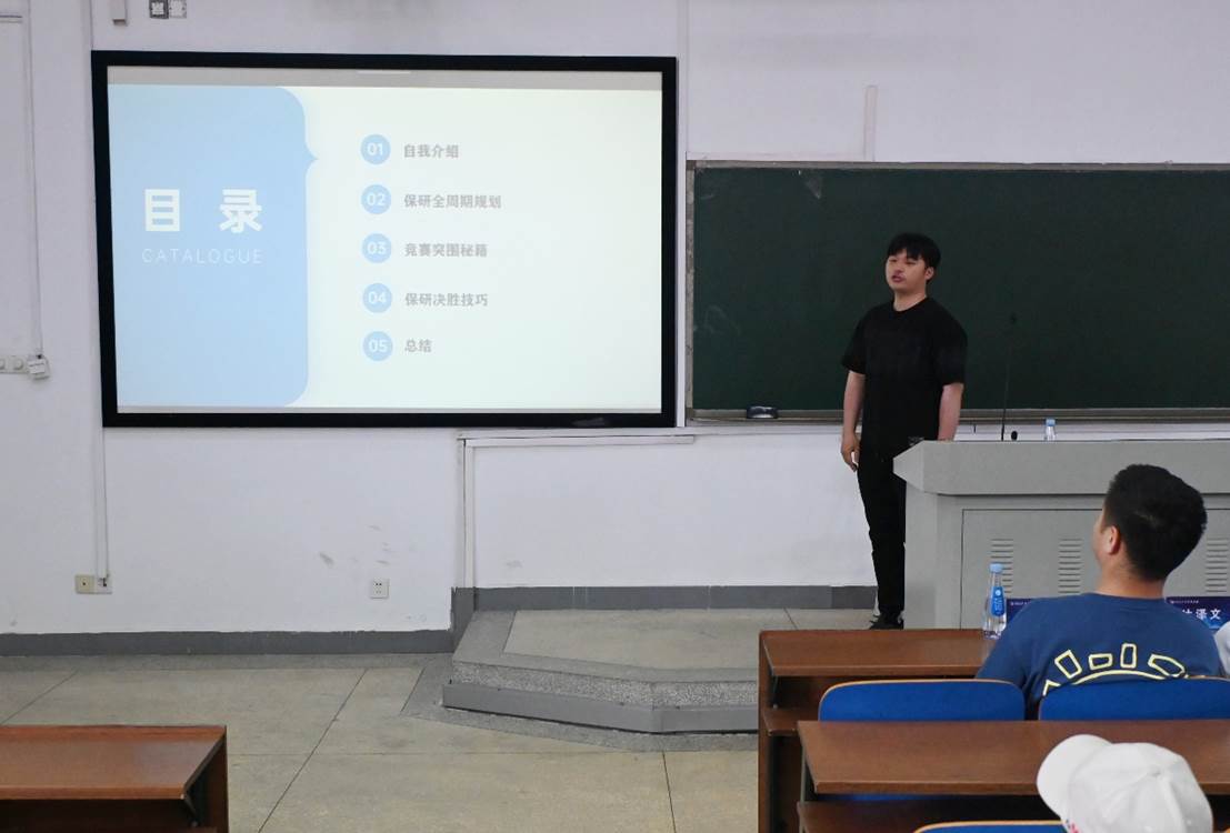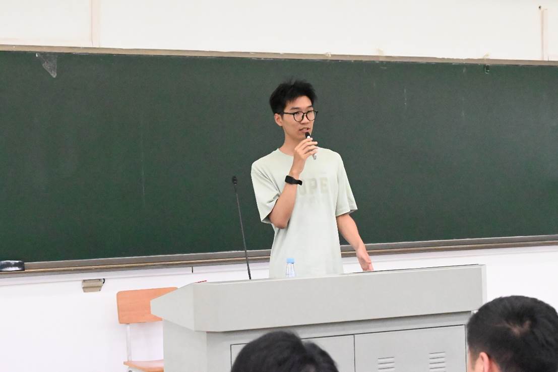黄志轩围绕保研主题展开分享。他详细介绍了确立保研目标后在学业成绩、科研实践、竞赛活动等方面应做的准备,展示了大一至大四的总体规划路线,建议同学们在保证加权成绩的同时,积极参与科研项目,提升科研能力,参加各类学科竞赛,锻炼综合素质。他指出,保研是一场持久战,需要保持高度的学习热情和自律精神,既要在关键选择中深入思考、慎重决策,又要有“道阻且长,行则将至”的恒心、不懈努力。