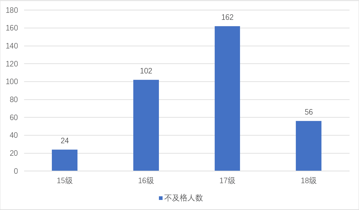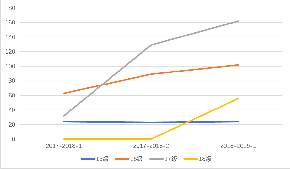 17级和16级挂科人数偏多,15级挂科人数最少。16级和17级同学的学习态度急需提高;15级同学学习态度端正,应该继续努力保持;18级同学初入大学,学习较为认真,但仍有些员工没有及时调整好,还需要继续适应并提升自己。