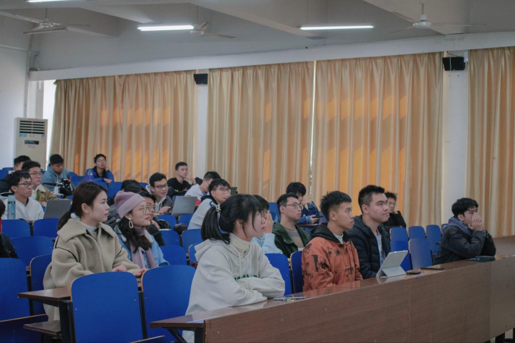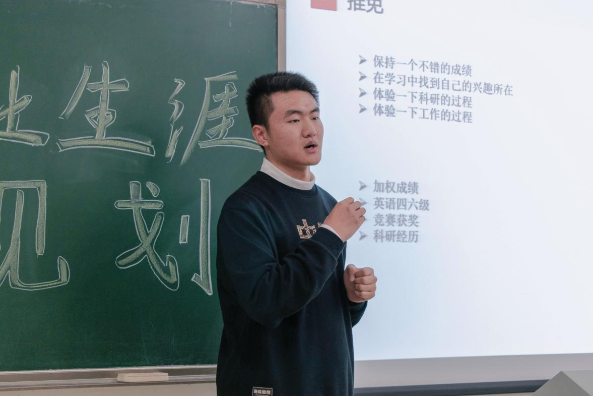 接着,主持人邀请了保研寝室上台进行学习经验分享并为同学们答疑解惑。他们就职业生涯规划的出路方向和选择做了详细介绍。姚文进同学用两句话概括了大学应有的态度:“多方涉猎,多闻多问”。陈彦廷进行了大学该如何选择未来职业发展方向的经验分享。陈冉飞则以自身经历强调探索路程,走自己适合的道路的重要性。知行合一,经世致用,广泛求问,坚韧不拔的精神,是同学们在完善自身职业生涯规划的重要支撑。