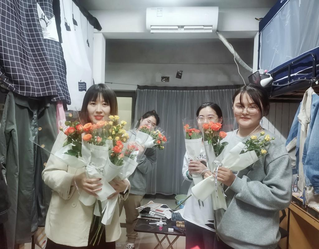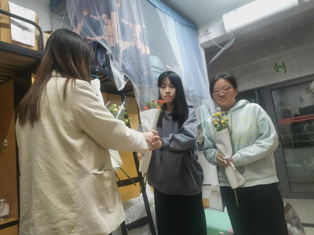 由王睿卿老师亲自带队,年级长和班委陪同,为所有寝室的女生送上节日的祝福以及花朵,赢得了大家无数好评。大家脸上洋溢着幸福欣喜的甜美笑容,寝室里充满的和谐欢快的节日气氛。在收到礼物和祝福的同时,女生们也不忘表达自己的感谢和祝愿。伴随着声声祝福、句句感谢,本次活动渐渐走向了结束。