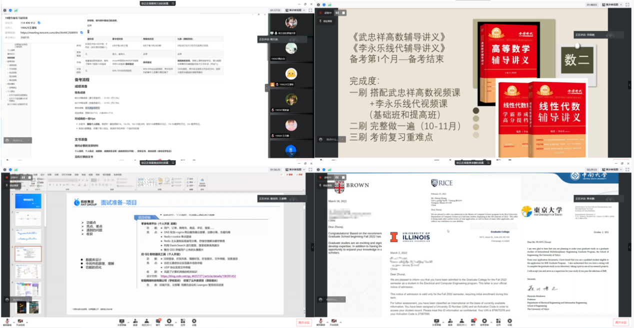 本次会议也是邀请了四位优秀的18级学长学姐从保研、考研、实习就业、出国留学四个方面进行了详细讲解与经验分享。保研于北京大学软件与微电子学院的姚文进学长向大家介绍了如何保研与自己的保研经历。凭借418分的傲人成绩成功上岸的李雨捷学姐向同学们介绍了考研规划与时间安排。以sp的评级拿到了蚂蚁集团offer的董润泽学长向同学们介绍了实习面试的方法与技巧。即将前往伊利诺伊香槟大学分校就读的黄卓麒学长向同学们介绍了出国留学的过程方法与当前可能面临的种种情况。