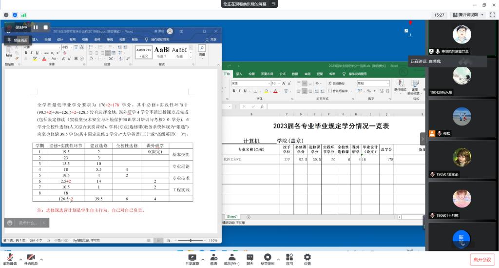 接下来由费洪晓老师细致讲解关于学分、实习的要求。费老师从学分开始讲解了第七第八学期所应完成的教学内容,要求同学们认真完成实习,如期提交实习报告,并详细说明了实习规定、实习分类、实习文档格式、实习文件提交等内容。之后费老师还对如何撰写毕业设计论文做了相关指导,对同学们提出的问题一一进行答疑,解决了不少同学的疑问与困惑。