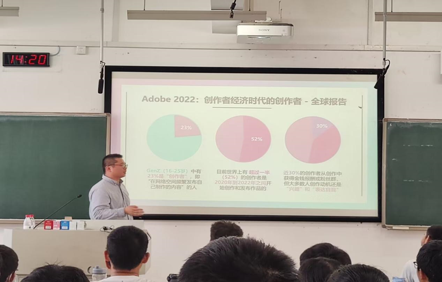 随后,张展先生为同学们带来了万兴科技在科技展台上的作品录像,以更直观的方式诠释出“元宇宙”在《韦氏词典》中的含义:“一个高度沉浸式的、人们可以在其中聚集,并进行社交、娱乐、工作的世界”,并指出其在近年来风靡的现实意义,课堂反响热烈。