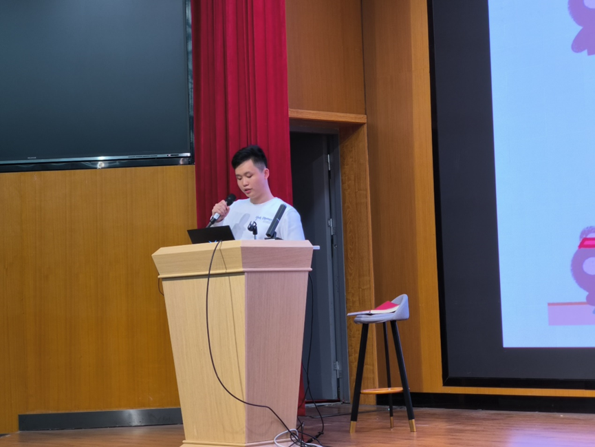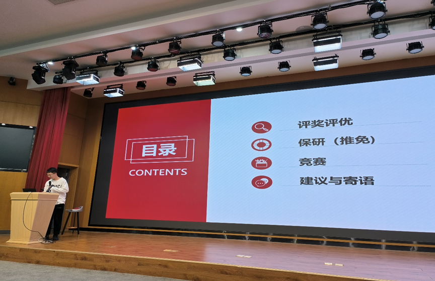 紧接着登场的是已推免至北京大学的肖佩学长。分享会上,肖佩学长就大学四年重要学习路径以评奖评优、保研、竞赛顺序依次介绍,并配以生动有趣的图片,使得大一同学在最开始便对大学四年的学习历程有了全局性的认知与规划。