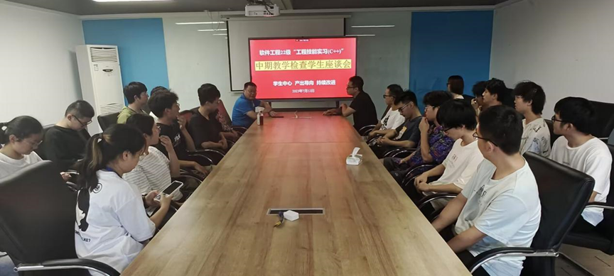 2023年7月12日在软件系费洪晓教授与辅导员何星霖老师的主持下中期教学检查员工座谈会顺利召开。会上同学们畅所欲言、各抒己见,不仅总结了这十天来在基地的学习生活的切身感受还提出了诚恳务实的意见建议,从而让下一阶段的实训工作得以更好开展,同时也为学弟学妹们的实训活动提供了宝贵的经验。