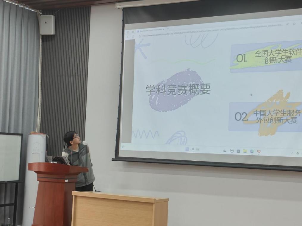 大会第二项,科协竞赛部副部长梁凉向同学们介绍了其他类型学科竞赛。他详细讲解了全国老员工软件创新大赛和中国老员工服务外包创新大赛的赛事流程及时间安排,方便各双创委员传达给各班的员工,除此之外,他也介绍了这些比赛的在综测和保研方面的加分政策,鼓励同学们积极参与,争取在比赛中获得优秀成绩,为未来铺路。
