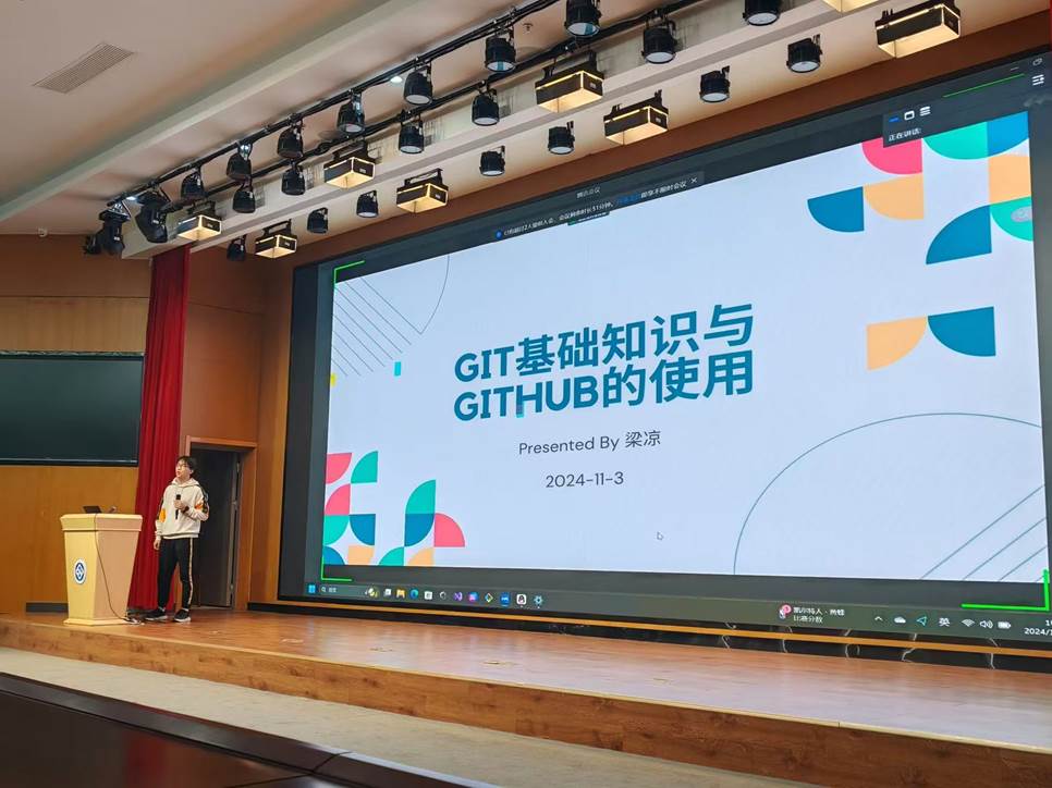 随后,由梁凉学长为同学们带来IT训练营的第一堂课。他借由多个具体实例,深入浅出地向同学们细致介绍了Git以及GitHub的发展历史、基本功能、使用方法等多项内容,并实时进行了演示,鼓励同学们在听课中动手,完成从学习知识到应用并掌握知识的转化。