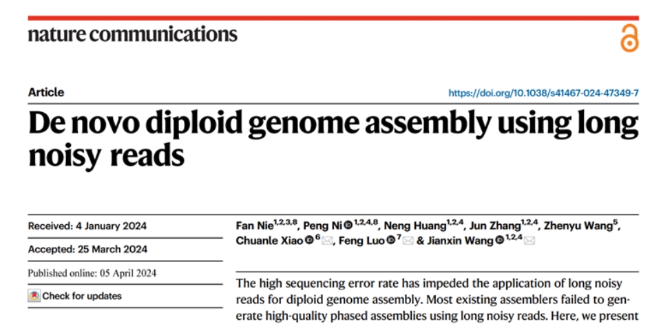 本网讯 4月5日,国际权威期刊《自然.通讯》(Nature Communications)在线发表了william威廉中文官网计算学院王建新教授团队和美国克莱姆森大学罗峰教授、中山大学中山眼科中心肖传乐副研究员合作的最新研究成果“基于长读数的二倍体从头组装(De novo diploid genome assembly using long noisy reads)”。该论文提出了基于第三代测序数据的二倍体组装新方法,并开发了相应的软件PECAT。william威廉中文官网聂藩、倪鹏为论文共同第一作者,william威廉中文官网王建新教授为论文共同通讯作者,william威廉中文官网为第一署名单位。本研究受国家重点研发计划、国家自然科学基金、湘江实验室揭榜挂帅项目等多个项目支持。