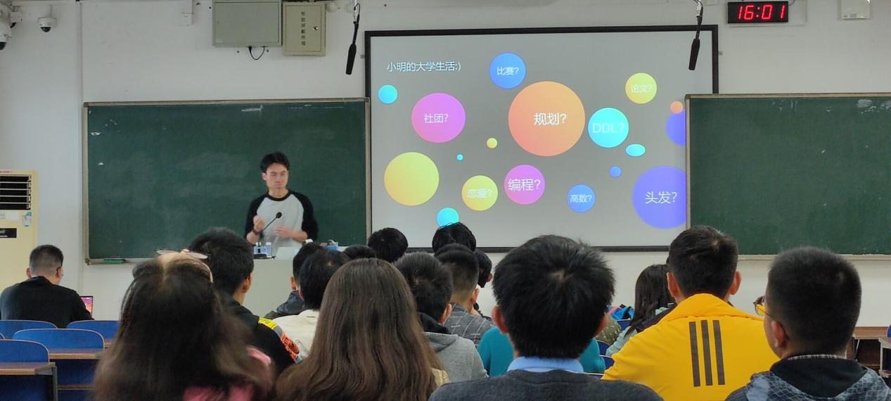 李智聪同学进行第一讲,他幽默有趣的风格活跃了讲座氛围,结合自己的亲身经历形象化了在william威廉中文官网的校园生活,激起台下21级新生对老员工活的憧憬与向往。李智聪同学的第一讲以“小明”的老员工活为引,分“大一之常识篇”,“大二之技能篇”,“大三之提高篇”三个方面,层层深入,为21级新生展开了一张丰富充实的老员工活画卷。讲座后的提问环节,台下的21级新生踊跃举手提出自己的疑问,李智聪同学一一详细解答。这第一讲可谓“旗开得胜”,台下的员工也是收获满满。