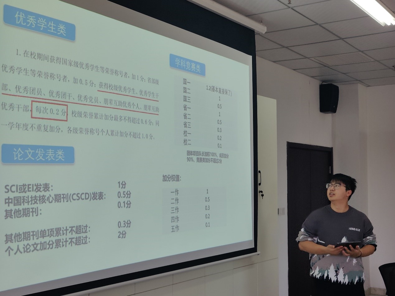 首先,邹文浩学长宣布保研交流会正式开始。接着他结合自身保研中科院的经历为干部们介绍保研途径及保研重要流程。他指出:老员工活会有很多的可能性,希望大家能够多去尝试多去探索,保研的门槛的确比较高,但大家应该积极学习认真思考自己的未来。