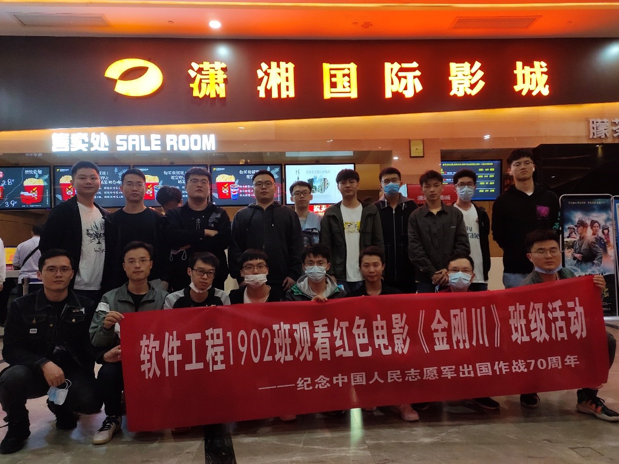 为进一步巩固“不忘初心、牢记使命”主题教育成果,深入学习贯彻党的十九大精神,了解党艰苦卓绝奋斗的光辉历史和伟大的英雄成就,10月23日,软件工程1902研究生班组织观看红色电影《金刚川》班级活动,纪念中国人民志愿军出国作战70周年。