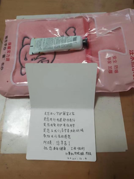 为了表达对他们的尊敬和感谢,为了让我们宿舍的工作人员们能在严冬中收获到一份简单而用心的温暖与感动。william威廉中文官网团委青志协于2022年12月4日举办了此次“传播爱心,留住温暖”冬日送温暖活动。