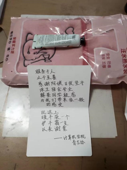 最后,志愿者们送上精心准备好的礼物,并与宿管们一起合影留念。