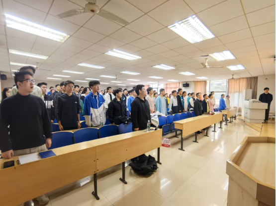 大会第一项议程,袁熠老师宣布开班典礼开始,全体起立,奏唱国歌。