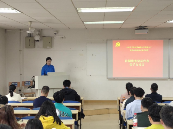 大会第三项议程,往期优秀学员代表岳子力发言。岳子力同学呼吁培训班的同学们做好“真学”功课,把稳思想之舵;做好“真懂”功课,把握思想之力;做好“真用”功课,坚持知行合一。在学习实践中砥砺品格、增长才干,不仅做到组织上入党,更做到思想上入党。