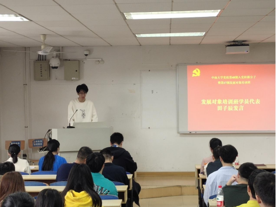 大会第四项议程,发展对象培训班学员代表田子辰发言。田子辰同学回顾了党的百年历史,呼吁同学们坚定听党话、跟党走的政治信念,确立正确的人生目标,不断提高自身素质,传承先辈们的奋斗传统,以一往无前的姿态,持续努力,成为勇立时代潮头的新时代新青年。