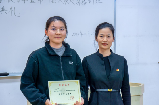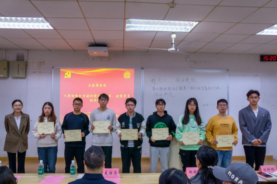 大会第五项议程,发展对象培训班班导师周清菡、积极分子培训班班导师袁熠为入党积极分子培训班优秀学员,组织干事刘珍珍为优秀学员标兵分别颁发奖状。